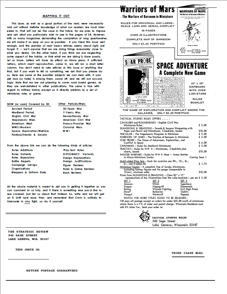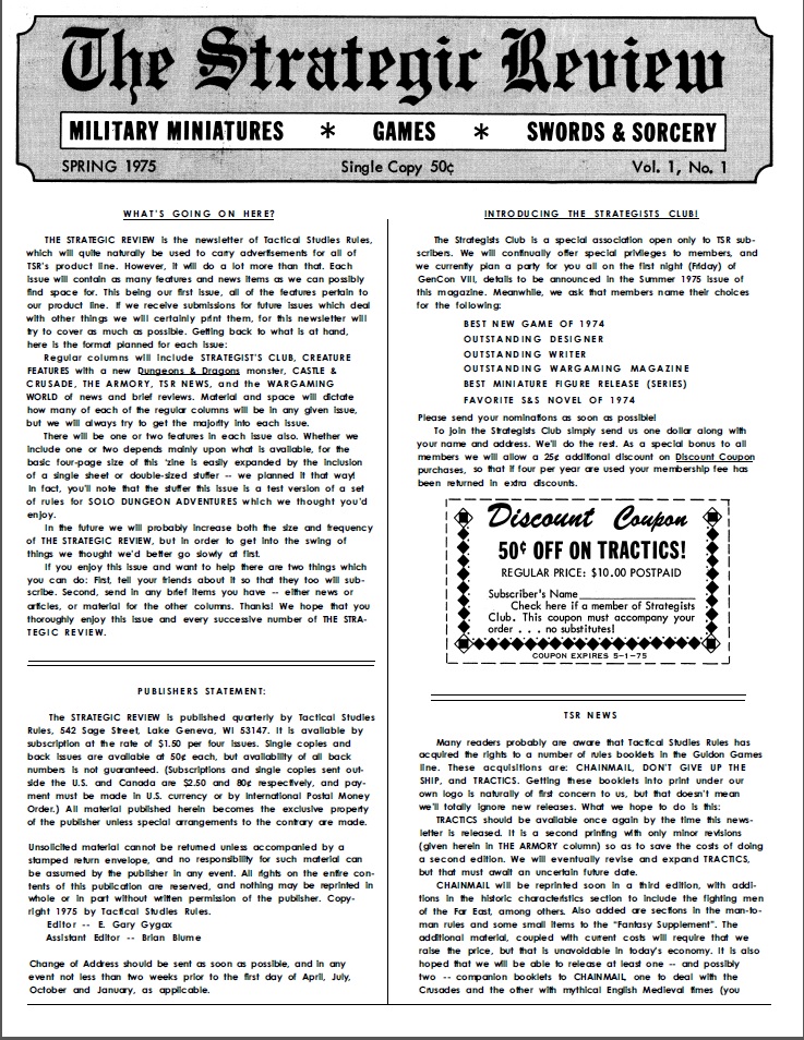 After the publication of the three volumes compiling the rules for D&D and before the supplements that would add a lot to those rules the publication of The Strategic Review started. This short lived publication was the official newsletter of TSR (Tactical Studies Rules), the company founded by Gygax and friends to commercialize not only D&D (which wasn’t their main product of the time) but other games, like Chainmail, Warriors of Mars or Star Probe. The company has a different name but the same initials as The Strategic Review (also TSR), get it? I bet they thought it was funny at the time, but it just becomes confusing after a while.