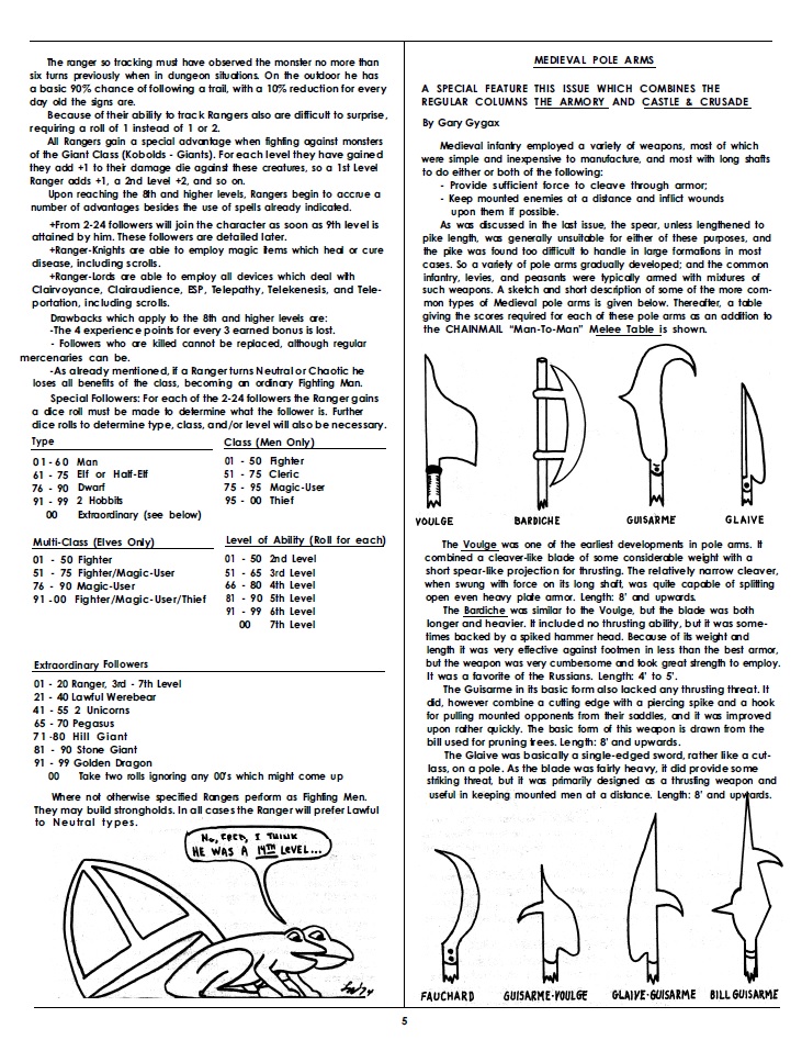 The other two articles bring us a new creature and a new class, both of which are now classics of the game. The new creature is the Roper accompanied by a terrible but terribly endearing illustration of the monster with some dragons next to it. The new class is the first iteration of the Ranger class, similar to what it is today, it was a mix between the fighter and the cleric, getting some spells at level 9 and being good at tracking things. They are classified here as a subclass of “Fighting Men”, the original Fighter class, much in the same way as the Paladin was.