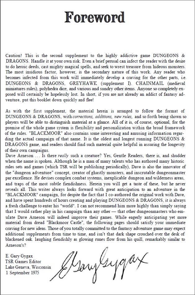 The second supplement to Original Dungeons and Dragons comes from Gygax’s TSR partner and D&D co-creator Dave Arneson. If supplement one was only an addition to the original rules, adding more monsters, items, traps and classes, this is both that and a little bit more.
