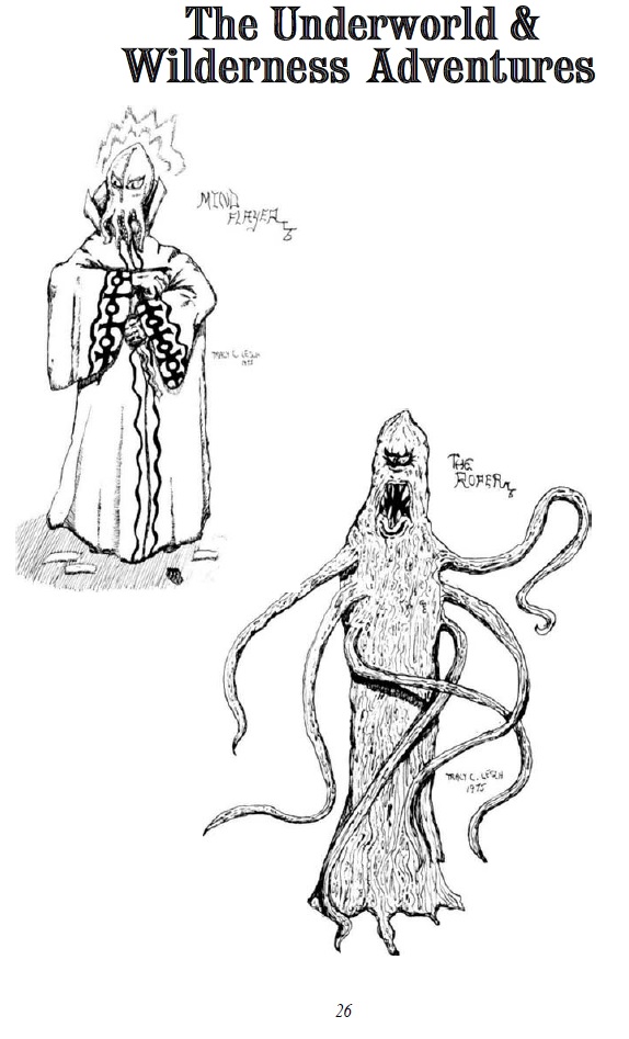 Much as in the Greyhawk supplement, the Blackmoor supplement isn’t a source book for the Blackmoor campaign. Much as in the previous supplement, new classes (Monk and Assassin) are added to the game, as well as new monsters with a particular focus on Giant animals (Giant Rats, Spiders, Otters, etc.) and submarine creatures like Mermen and Sahuagin. In fact there’s a whole section with rules for underwater combat. There is also a curious section with rules for dismemberment and “head shots” which is kind of reminiscent of Fallout mechanics.