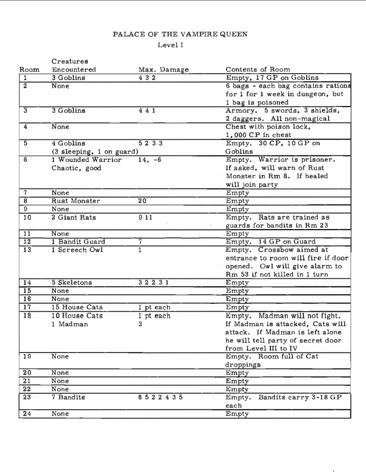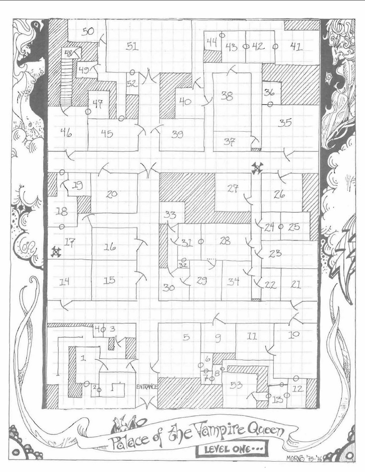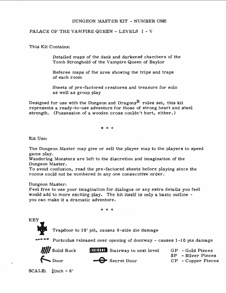 Although there had been previous adventures available as part of tournament games at conventions, like previous year’s Tomb of Horrors, and a small incomplete dungeon as a part of the Blackmoor supplement, Palace of the Vampire Queen was the first stand-alone adventure published and sold commercially. Although not produced by TSR it was distributed officially by them.