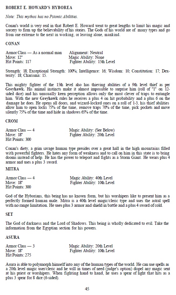 This seems to be addressing a problem which is described in the foreword of the book as well as in previous issues of The Strategic Review about some players going all the way up to level 40, the gods here seem to set a top level with which players can be compared. If Odin has only 300 hp and the powers of a lvl 20 fighter, it’s hard to believe in a level 40 human fighter. That is one of the uses of the book, but a whole supplement to make that point seems to be too much. A useful thing I can find here, though, are the lists for divine items, from Mjolnir to Toth Amon’s ring, which could make for prized items in Raiders of the Lost Ark type adventures.
