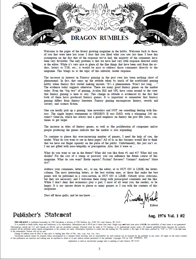 The second issue of Dragon is more a literary magazine than really a D&D magazine, over half the space is taken up with the three short stories that are ongoing, one of them by Gardner Fox, a famous author in his own right, Shadow of a Demon, is simply a Conan story by a different name, fun but without the brilliance of Robert E. Howard. A barbarian, Niall, has to save a girl from an evil magic user in a pretty boiler plate Sword and Sorcery tale. Why is this here? Well the flavor is similar to D&D and I imagine it’s just the coup of having a Gardner Fox story for their magazine. If you don’t know Gardner Fox, he is most famous for having invented the DC comics multiverse and being the co-creator of Barbara Gordon, The Flash, Hawkman, Doctor Fate, Zatanna and the original Sandman, as well as coming up with the concept of the Justice Society of America, later Justice League.