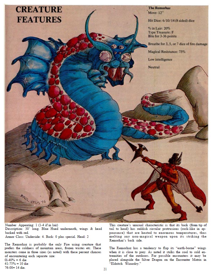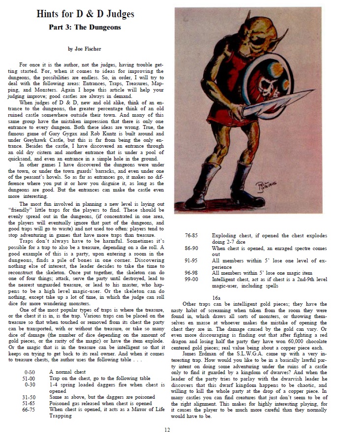 Outside the literature stuff you get some nifty game mechanics and rules stuff, a whole article on how to setup Monk advancement battles, an article on how to make good Dungeons for your game, a new monster in the Remorhaz and a whole new class for the Magic User, The Alchemist, who can make and cure poison, as well as all kinds of potions and stuff. There’s also a short column on an alternative way to determine weapon damage… but it isn’t very convincing.