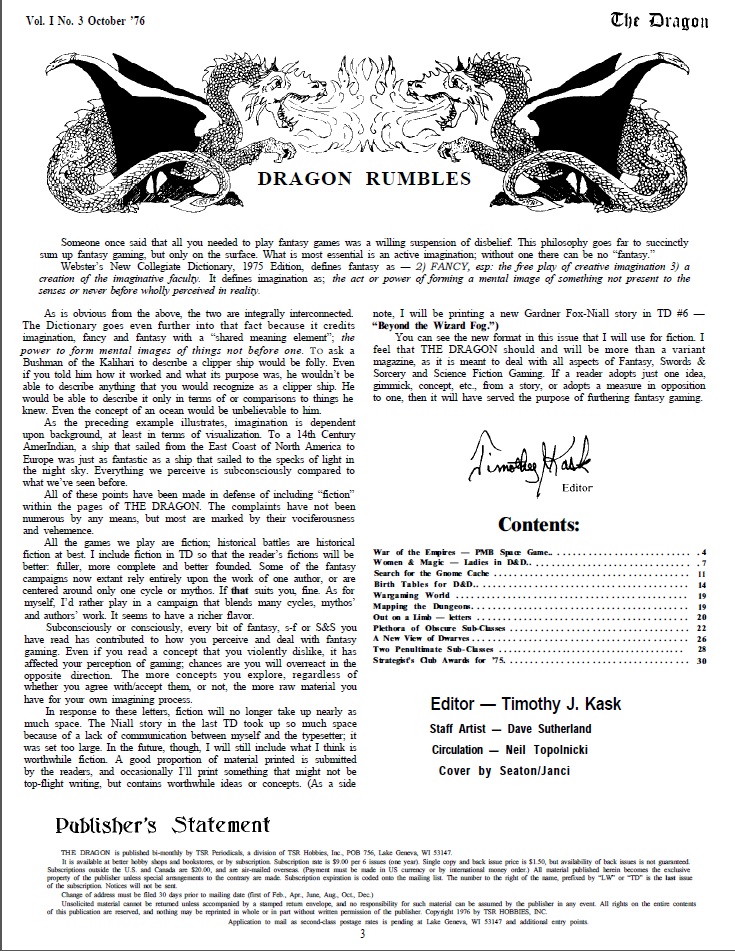 The third issue of The Dragon comes around and this time the amount of fiction has been reduced, fortunately, with only Gygax’s The Goblin Cache serial continuing, and most of the magazine with the exception of a couple of articles is dedicated to D&D. Some of the D&D stuff is good, some of it is pretty atrocious.