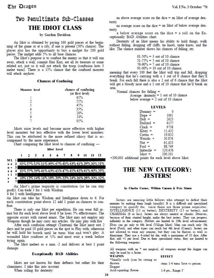 Let’s start with the bad stuff first. There’s a whole article on “Women and Magic” which sets up gender differences in D&D, it would have been much better if they didn’t though. Written by Len Lakofka, the article says that women characters do not have Charisma stats, but only Beauty stats as a replacement, which allows them to “charm men” and is useful particularly for thieves. Can only have a strength score of 14 maximum and can never be as good fighters as men, get fatigued by heavy armor and can’t carry large weapons without attack penalties. It’s all pretty much as cringe inducing as you would expect. The names for women’s levels in Thief include: Wench, Hag, Jade, Succubus and Gypsy… ouch. On the bad side we also have a specialist class called Jester which gives Dwarves and Halflings bonuses because being small is inherently amusing. Oh the 1970s…