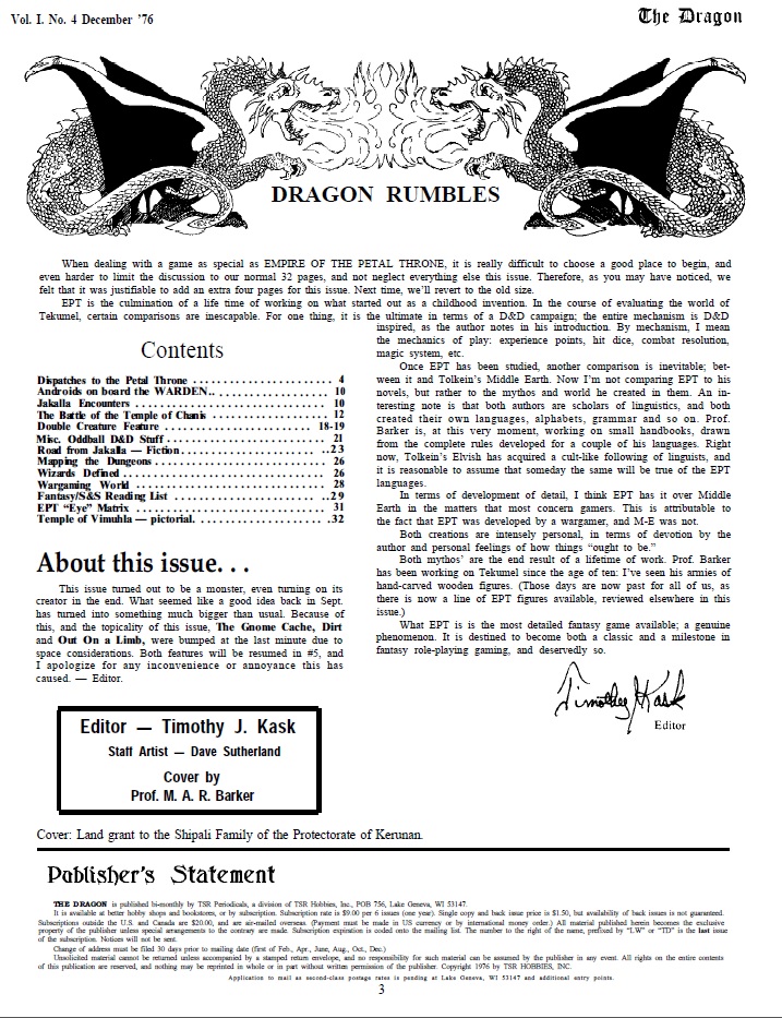 The fourth issue of Dragon and the last of 1976 is a special issue dedicated to Empire of the Petal Throne, another D&D-like game developed by M.A.R. Baker, a linguist, game designer and man that we now know also wrote neonazi novels under a pseudonym…so, you know, a complex figure?