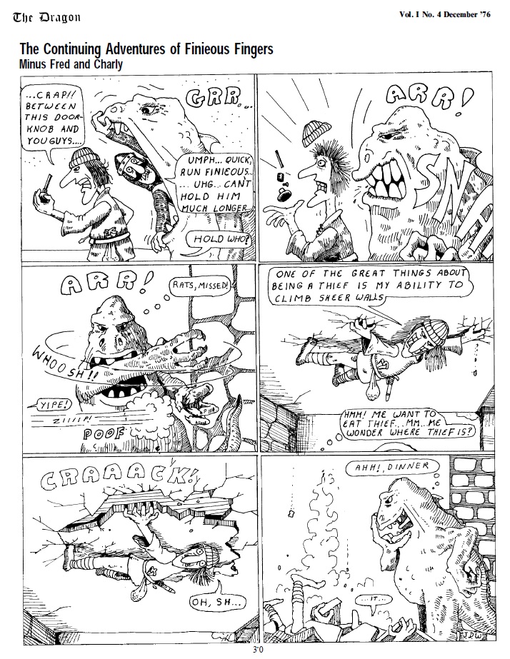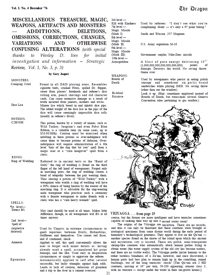 Anyway, because it is an EPT special issue there is little in terms of D&D content, many of the usual features have been suspended for this issue, the new creature is for EPT, etc. There are only two things of relevance for D&D fans, one being a humorous column with funny monsters and items, while the other is a review of some miniatures for use with D&D. Not much of interest here unless you are into EPT, which I’m not, so I skipped those articles. .