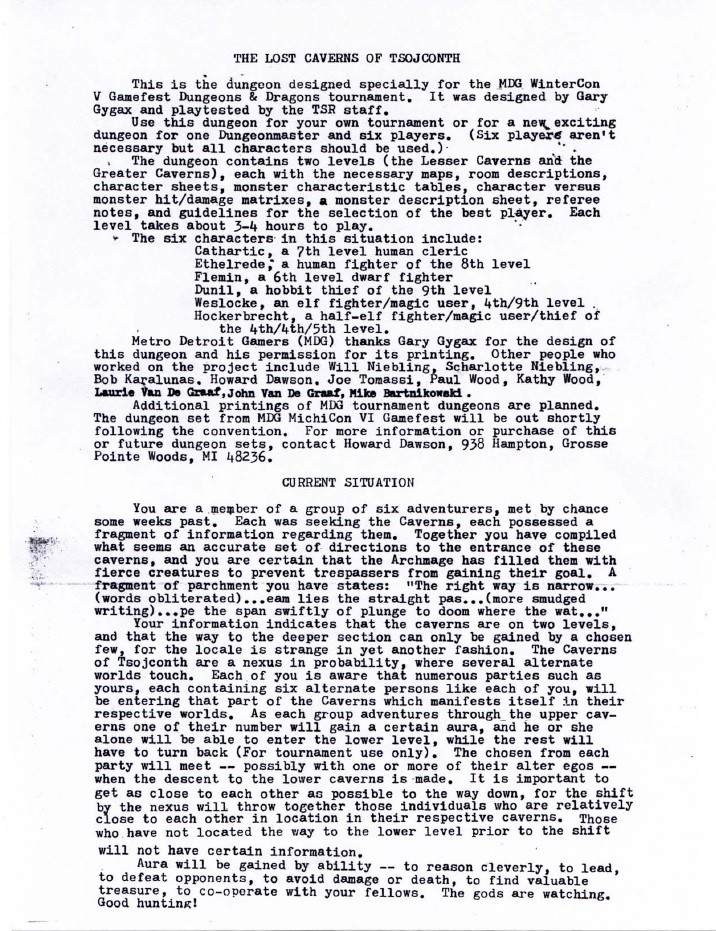 Not to be confused with the revamped 1982 module with the similar name of Lost Caverns of Tsojcanth, this is the original 1976 Winter Con V module that was used in a tournament context. As was typical of most adventures of this period, it consists of a couple of maps with descriptions of the contents of each room.