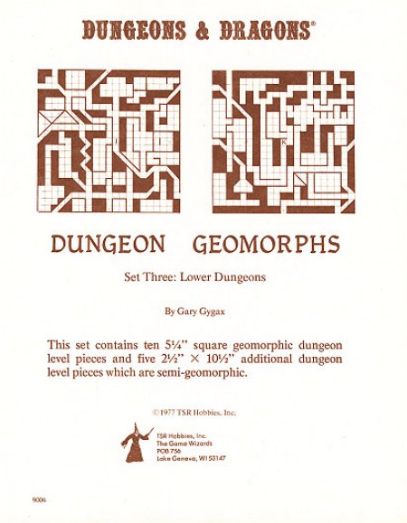 This third set is very similar to the first one (Basic Dungeon) but it adds more variety to the possible combinations of dungeons that one could possibly make. This is the last of the “interior” Geomorph sets, there would be another one for outdoors, which was supposed to be the start of another set of three, and later on the three interior geomorphs would be bundled into a single book.