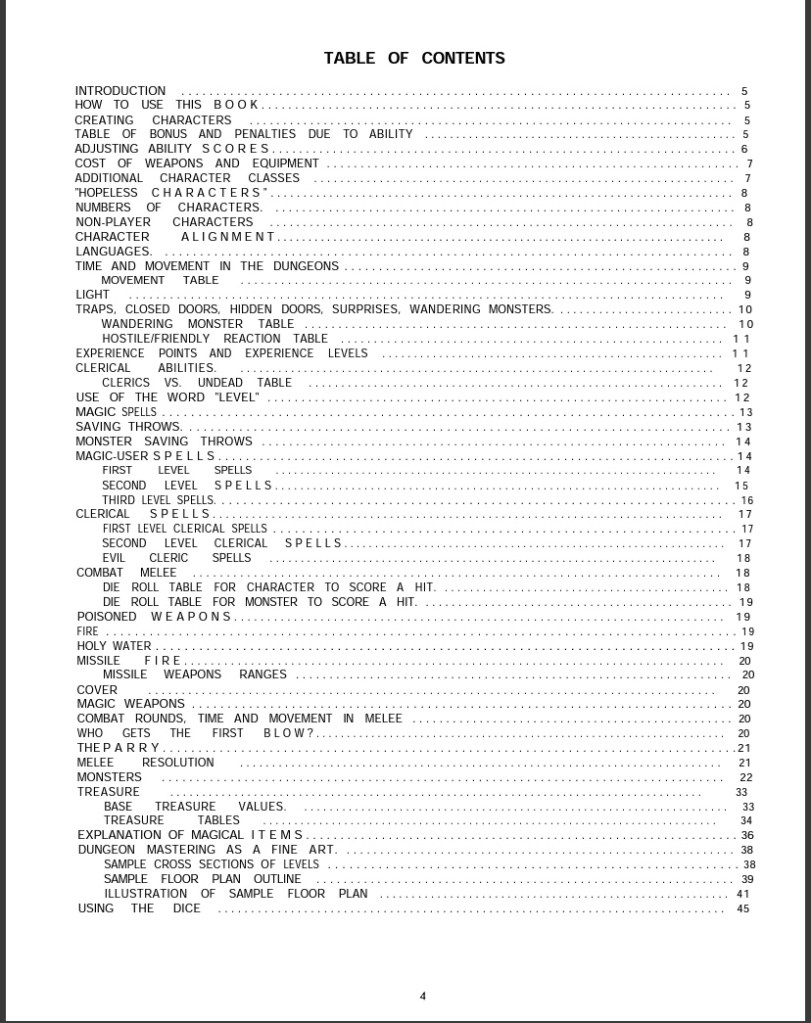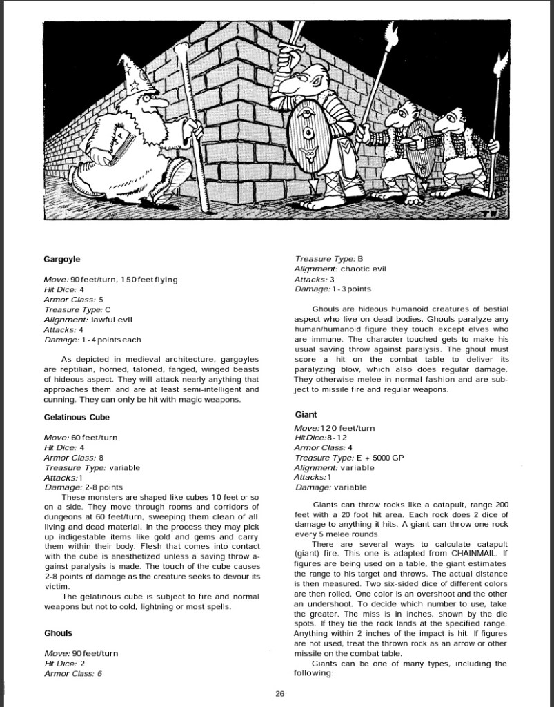 It’s actually a pretty good rulebook for D&D, much easier to read and understand than the original rules, as it has left all references to Chainmail wargaming behind, it has pretty much anything that you would need to start playing. From character creation, to monsters, to treasure, to a cool little sample dungeon to start you and your players out. I am sure this immensely broadened the appeal of D&D, with such a neat little set of rules all together in one place and aimed at a young audience.