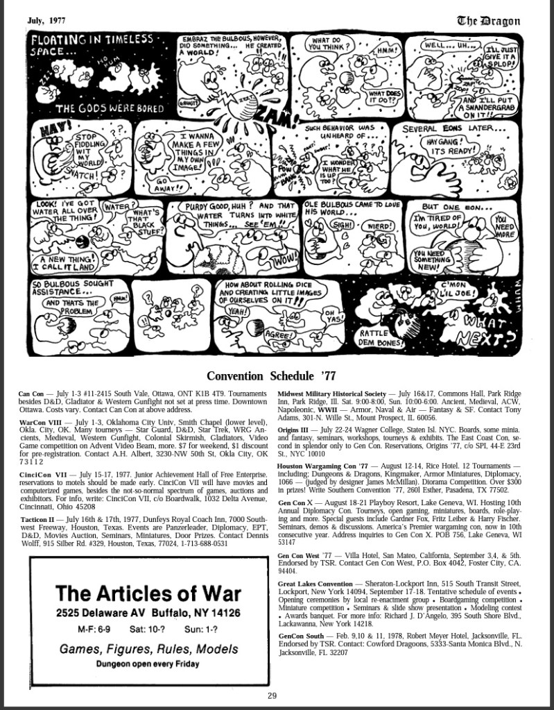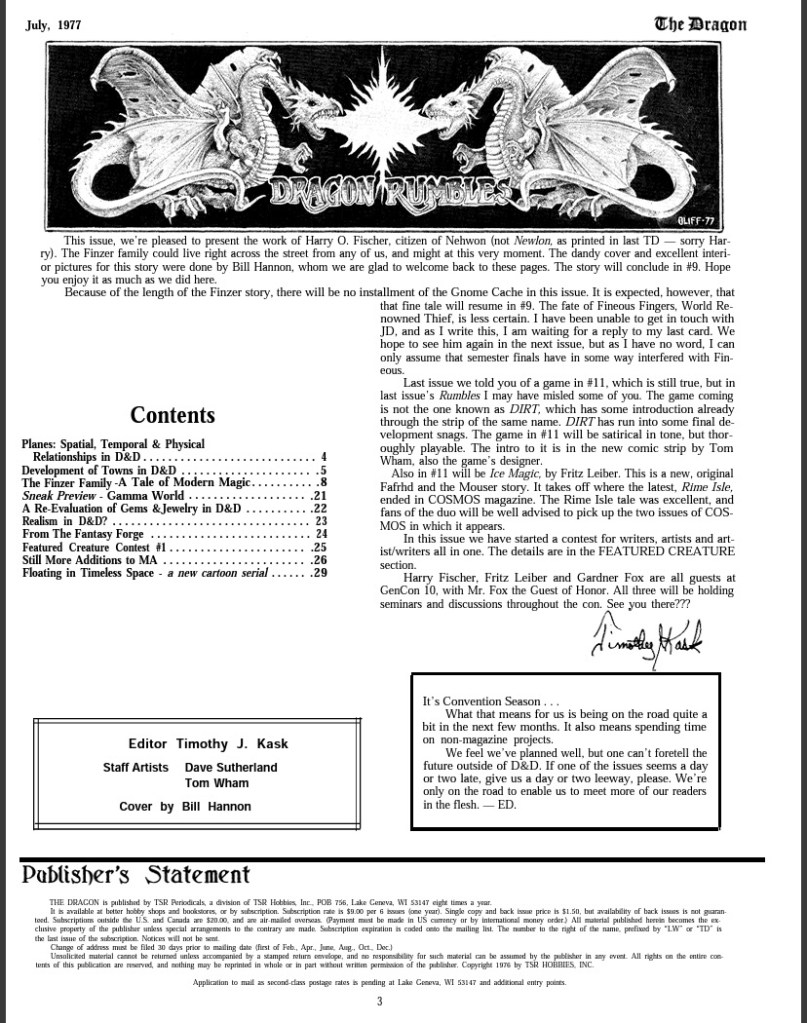 Leaning a bit heavily on what are pretty long fiction stories for a 30 page magazine about tabletop gaming, The Dragon #8 is still a pretty important issue for the history of D&D, if nothing more because of one article by Gary Gygax which is pretty formative for the game’s lore.