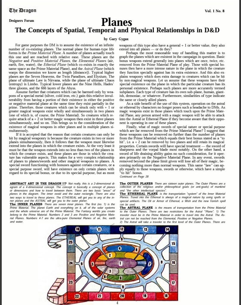 The Gygax article on Planes establishes for the first time, and experimentally, the concept of the several planes which will be the basis for the future conception of the various D&D settings. Even the name of the Prime Material Plane appears here first, as do the concepts of Positive and Negative material planes and elemental planes. We also get some of the Outer Planes that are still around in the game, even if some of the important planes like the Feywild and Shadowfel do not yet make an appearance.