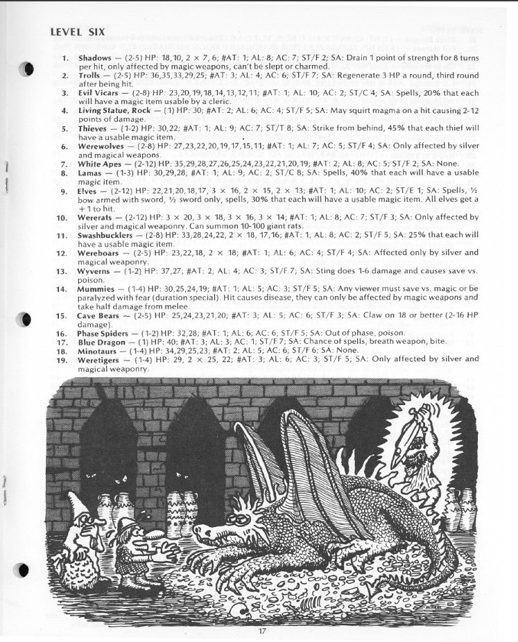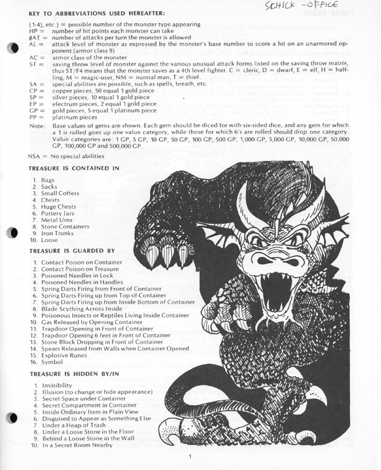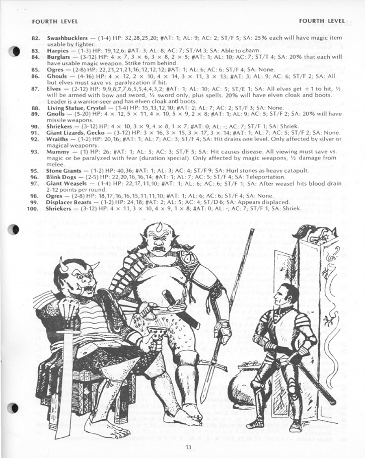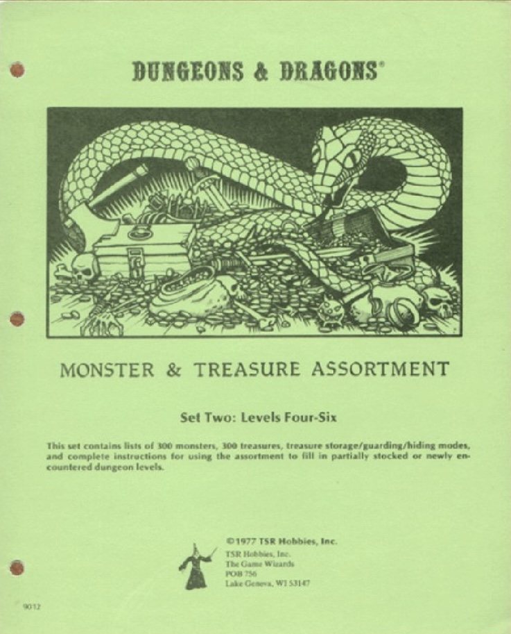 Very similar to the first set but now giving tables to determine random monsters and treasure, as well as traps and containers for the treasure, this would have been useful for DMs attempting to populate their dungeons. Put together with the geomorphs that came out at the same time, basically all the DM had to determine was the story behind the dungeon. Some cool illustrations, though.