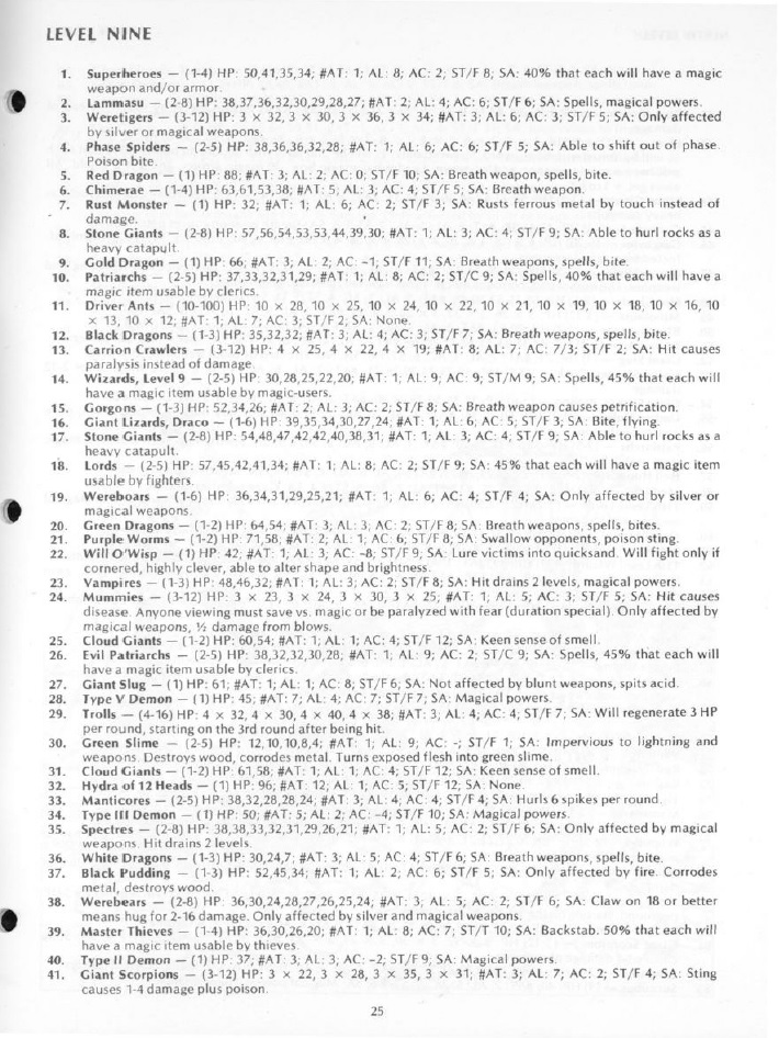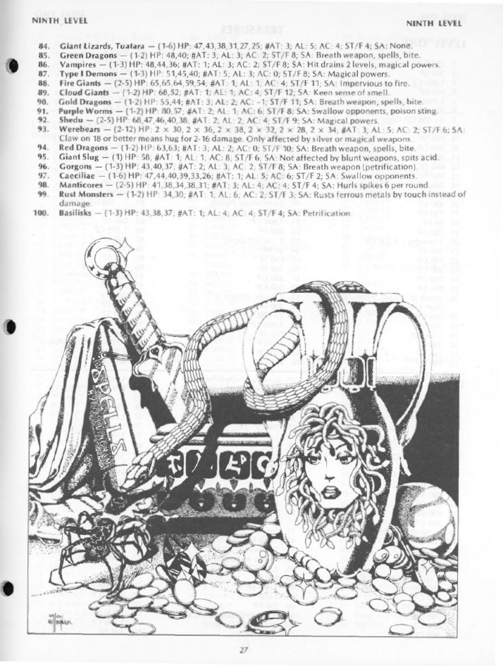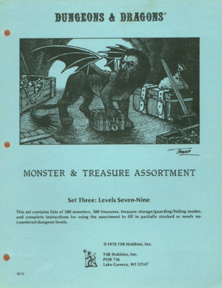 The third and last volume on the random Monster and Treasure generator, now for relatively high-levels, the first page of instructions has some good ideas on how to construct a dungeon, how many monsters should have treasure (20%) and warns you not to populate a dungeon solely in a random fashion, to have some Big Bads and use these lists for what we now call “trash” mainly.