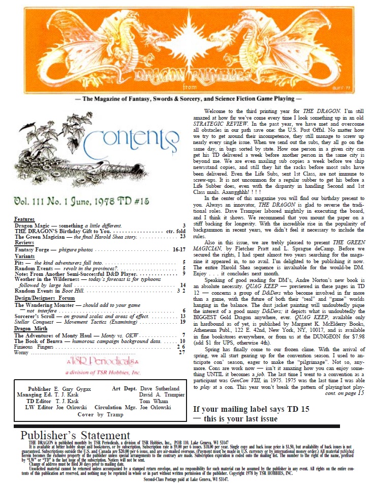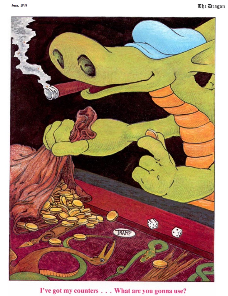 The rest of the magazine is taken up with articles on other games, fiction and the two regular comic strips, this time with a full page panel for Trampier’s Wormy. Worth noting that the main fiction piece here is a Harold Shea story by L. Sprague de Camp. Good stuff.
