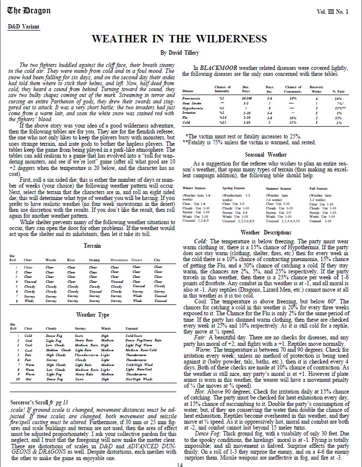 The humorous columns continue with the Monty Hall series, which I again find pretty dull. A table for random wandering monsters and another humorous article on good D&D preparation take up the middle part of the magazine. More usefully, however, we get Gary Gygax explaining differences in spell areas of effect because of the way in which scales change from dungeon to wilderness maps. Speaking of wilderness we also get some tables to randomize weather in the wilderness.