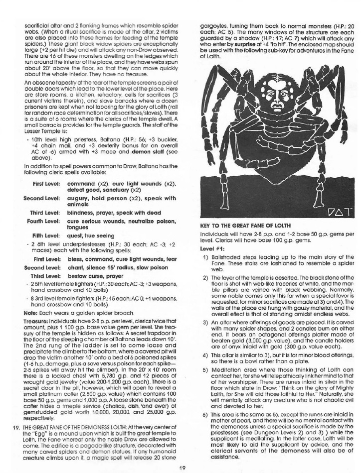 By the end of the adventure characters will find one of the most famous demon queens in D&D, Lolth, the Spider Queen of the Elves, the largest “dungeon” within the module being her fane. However, Eclavdra isn’t working for her, she is actually a servant of a rival of Lolth, so the logic behind this boss battle will have to be made up by the DM as there is no indication of it. Should the players manage to get transported to the Abyssal plane where the true Lolth resides they would have to wait for a couple of years to continue the story in 1980 with Q1: Queen of the Demonweb Pits. I’ll get to it eventually.