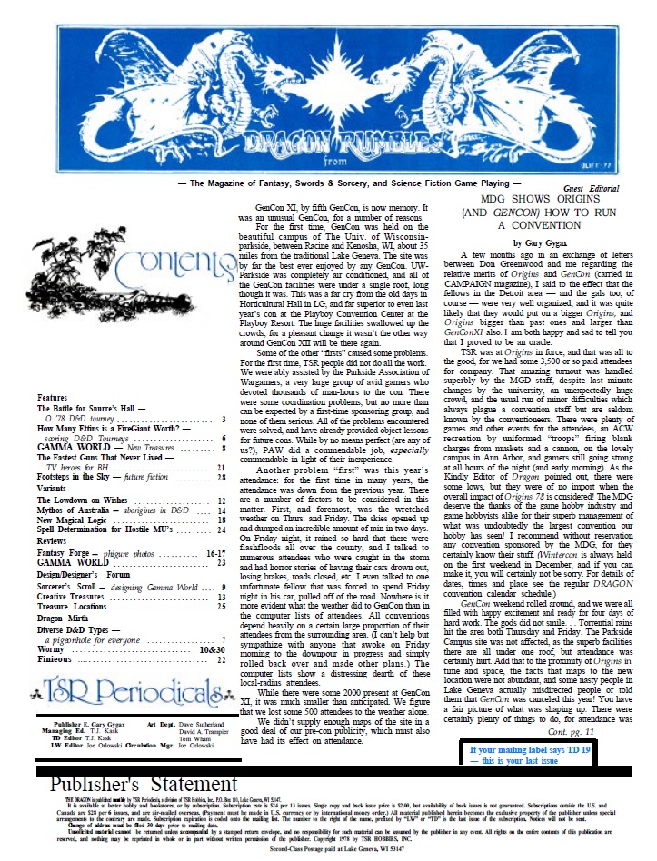 If, in the last issue of Dragon, Tim Kask complained a lot about some of the Cons that year in the editorial, in this issue Gygax takes over the editorial as a guest writer in what is clearly an attempt to put out fires. He compliments a lot of the organisers and also talks about how GenCon was a bit of a disappointment in terms of attendance for several reasons, mainly to do with horrible weather.