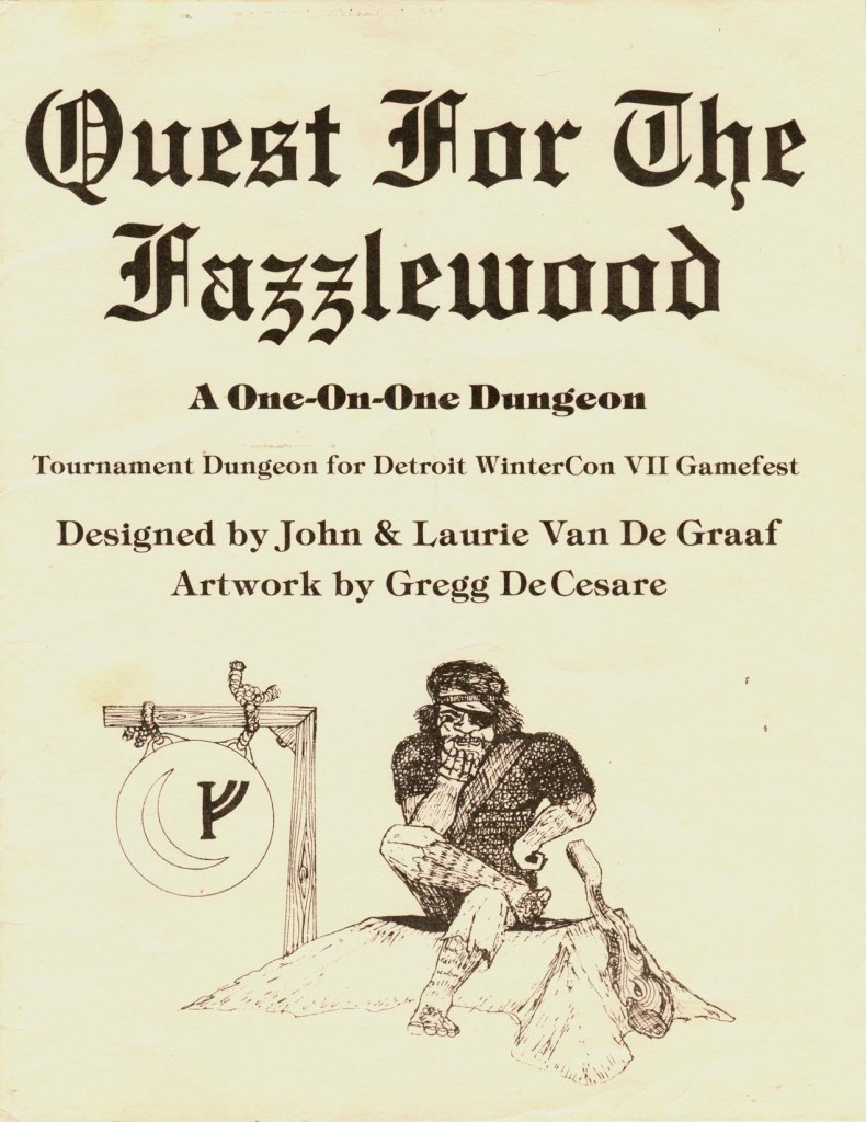 A tournament module for WinterCon VII, this would later be released in the 80s as part of The Gem and the Staff (O1) module. I did not have access to the adventure itself but I have the cover and a page of “notes”, meaning a kind of introduction to the adventure and the logic behind it.