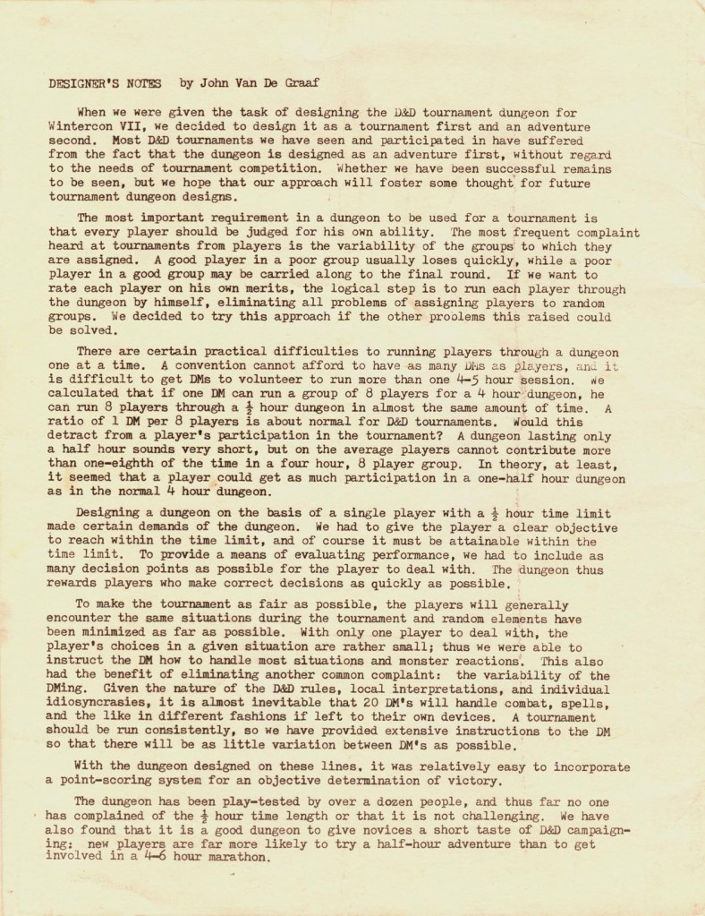 The idea is, then, to test individual players in a tournament setting in a very short, half-hour, adventure. So this is a module for 2 players, one being the DM and the other the adventurer to be tested. The idea was to find a way to test players that would be fairer than having a good player in a bad party or a bad player in a good party, either being dragged down by the other players or coasting through the game.