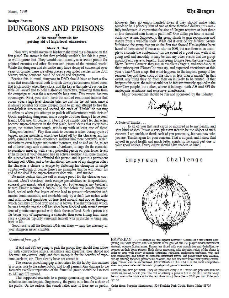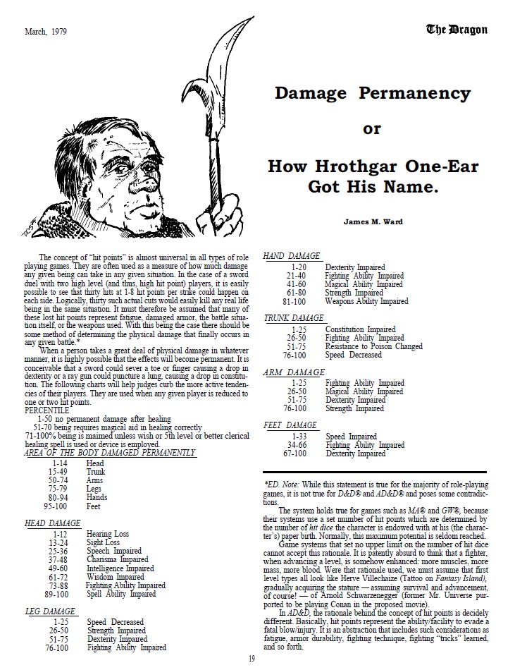 There’s also an interesting article on how to give characters permanent damage when they get all the way down to 1 hitpoint or something like that, including losing an eye, getting brain damage, getting a limb hacked off, etc. Although this is an interesting idea it could also really incapacitate characters in ways that are probably not that fun for players. Another article that can be quite punishing for players is one which tells DMs to just imprison high level characters to avoid “superman” problems… I mean it’s not that much better than outright killing them, but I suppose…