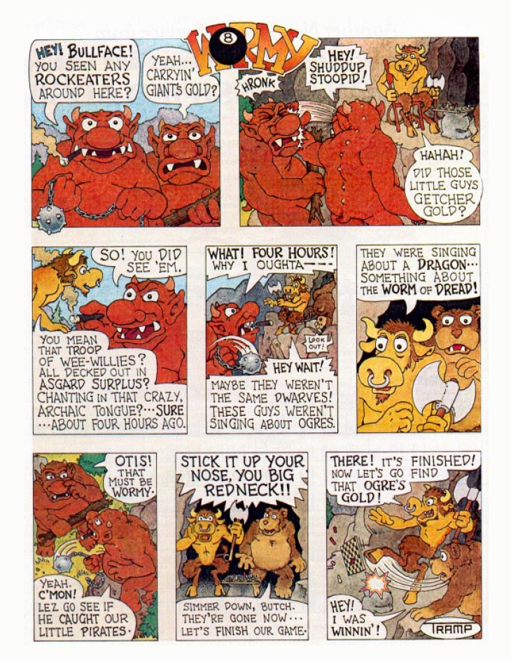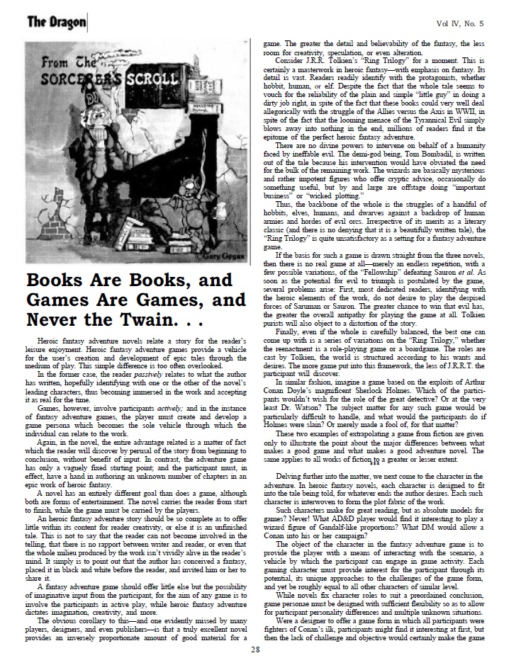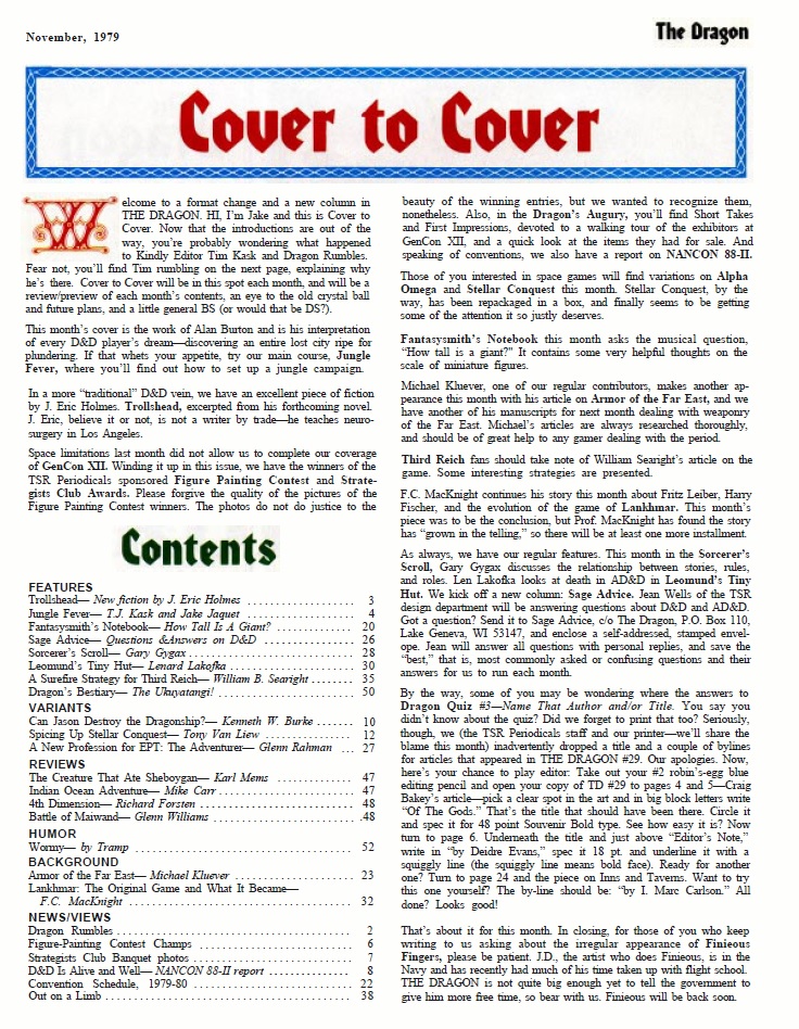 We get other usual features, with a new one by Jean Wells replying to rules questions from readers in Sage Advice. Gygax returns with Sorcerer’s Scroll this time about what makes a good setting for AD&D and how Tolkien is really bad as a template for a setting (his words not mine). Gygax also for the first time mentions that Drow would actually work pretty well as player characters… which is interesting seeing as that would later be a controversial move when the option became available. Lakofka’s Leomund’s Tiny Hut covers Death and Hitpoints, with some ideas about permanent damage to characters that didn’t really catch on.