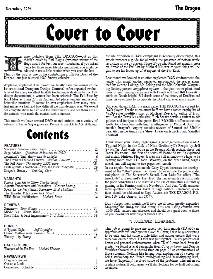 We finally get to the last Dragon Magazine of the 70s with issue #32, a brand new decade on the horizon where the growth of AD&D will be exponential, which also means that every year will take longer and longer for me to cover. Just to give you an idea there are 21 items in my 1979 list of things to cover, by 1989 that list had 92 items as of now (and I still have to add some things there). There’s still one more item to cover in the 70s on my next post but then the first decade of D&D is done.