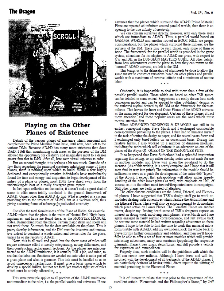 In terms of content this has the usual mix of features and articles, with a good article on planes of existence by Gygax, some really fun Sage Advice by Jean Wells and a large historical article on Druids. However, the real highlight here is the attached adventure module, The Fell Pass, the first such module bundled with the Magazine, the first of many, at least until Dungeon magazine comes out and takes over that portion of the content. A fun little adventure through a canyon full of grottos and threats, worth taking a look at.