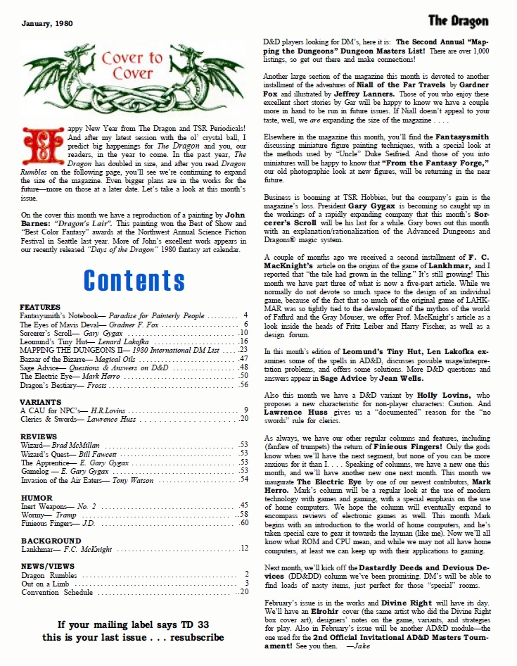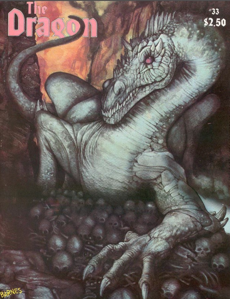 Welcome to the 80s! And the first thing we see from D&D in 1980 is the January issue of Dragon Magazine with a really cool cover, one of my favourites up until now, with that dragon just lounging on a bunch of skulls, like a lounge lizard, but bigger.