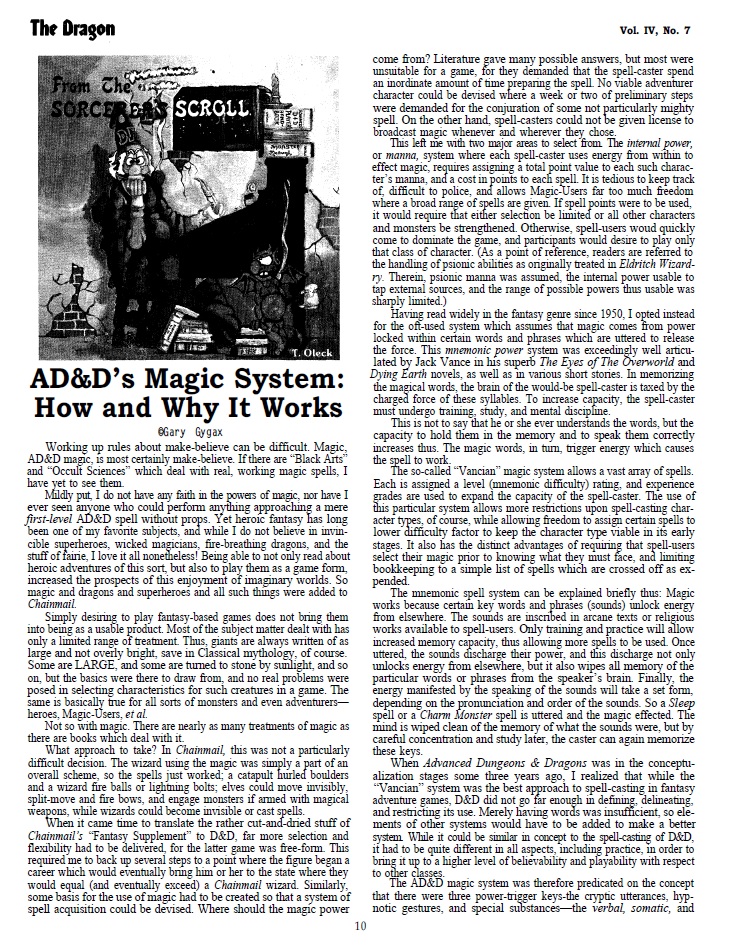 Also near the beginning of the magazine in the reader’s mail section (Out on a Limb) we get a color picture of Gygax, which readers really wanted to see with him having by now become a near mythical character in the TTRPG milieu. We have an interesting article by H.R. Lovins on having your NPCs have a CAU (caution) score, this is basically a scale that goes from friendly to hostile as to how they regard PCs at first glance, this is pretty much something that is already done without really needing to make it a “score”, but it’s a cool idea nonetheless… and many years later would be a thing on PC Games from Dragon Age to The Sims.