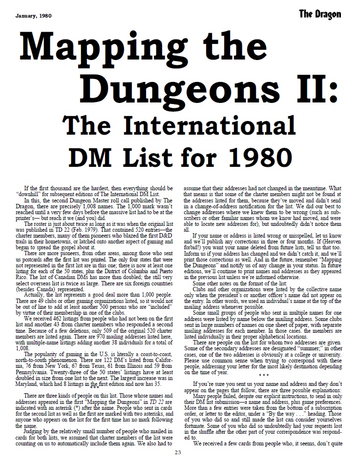 According to the editorial Gygax is now a very busy man, so the present Sorcerer’s Scroll will be his last article for the magazine for a while, and he dedicates this space to again explaining AD&Ds Magic System as well as what inspired it and why it is why it is instead of another system (such as Spell Points). Leomund’s Tiny Hut brings us some homebrewed changes to spells, completely unofficial suggestions by Lenard Lakofka and a large part of the issue is taken up with the DM listings for 1980. A new column shows up, The Electric Eye, covering innovations in PC Gaming, which in 1980 means fantasy text games on the Apple II (they don’t mention it, but the Zork series had started coming out in 1977 and was exactly that).