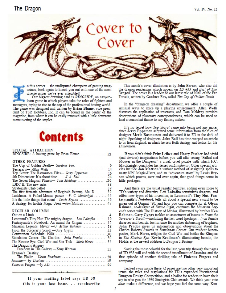 Leomund’s Tiny Hut brings us a fresh take on Dragons for AD&D and we also get the usual reader’s mail and beastie (this month the Flolite) as well as the comic strips for Jasmine and Finieous Fingers. As an extra in this issue we get a complete new game, Ringside, a boxing simulator, which kind of escapes the remit of the magazine, not being sci-fi or fantasy, but ok.