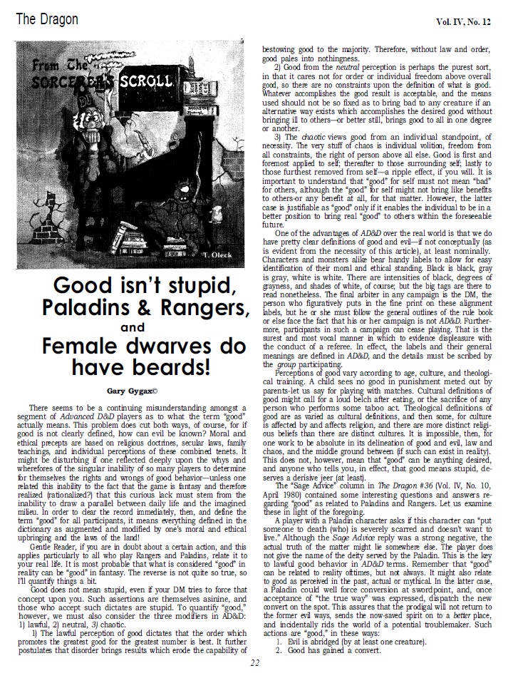 Gygax brings a column on how to play to your Alignment, with the idea that, as the title says “Good isn’t Stupid” and explaining that “goodness” is often relative to the moral and religious system followed, as well as explaining how to play different kinds (lawful, chaotic) of good.
