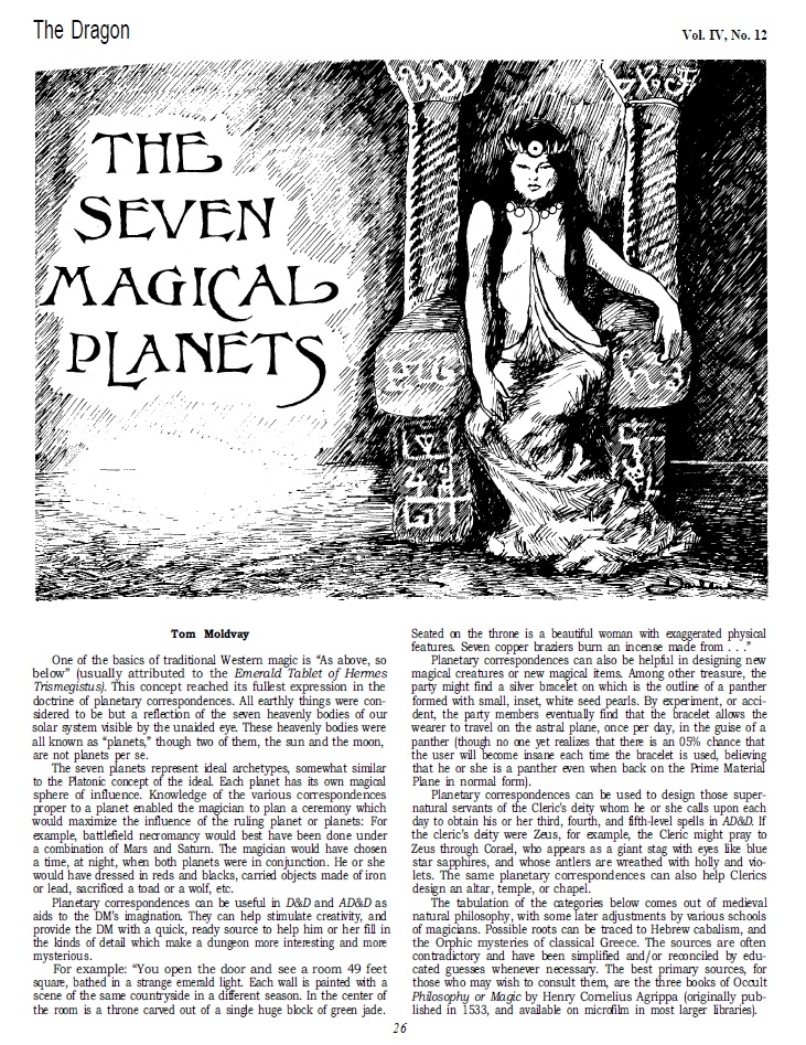A relatively light on specifically AD&D content issue, it does however contain some articles of general interest such as a follow up to the Dragon #17 issue on Tesseracts by adding a lot more information on how to use multidimensional cubes in dungeon design, or an articles on the Planets and associated Magical properties. This last one would have been at home on any Esotericism or Occultism popular publication with references to angels and demons associated with planets as well as numbers, colors, metals, stones, plants, incense scents, Tarot Trumps and animals and so forth. It does try to make the planets fit some of the D&D ideas of planes and beings, making it a pretty good resource.