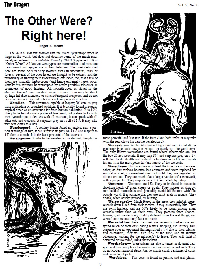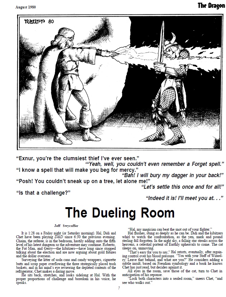 Moving on to more D&D and AD&D stuff, you get some articles about such stuff as setting up duels in the game, how to make funerals in appropriate fashion for both PCs and NPCs, creating “throwable” weapons, Molotov Cocktail style and a new take on the Turn Undead feature so that the Undead can get an even break, as it was slightly overpowered then.