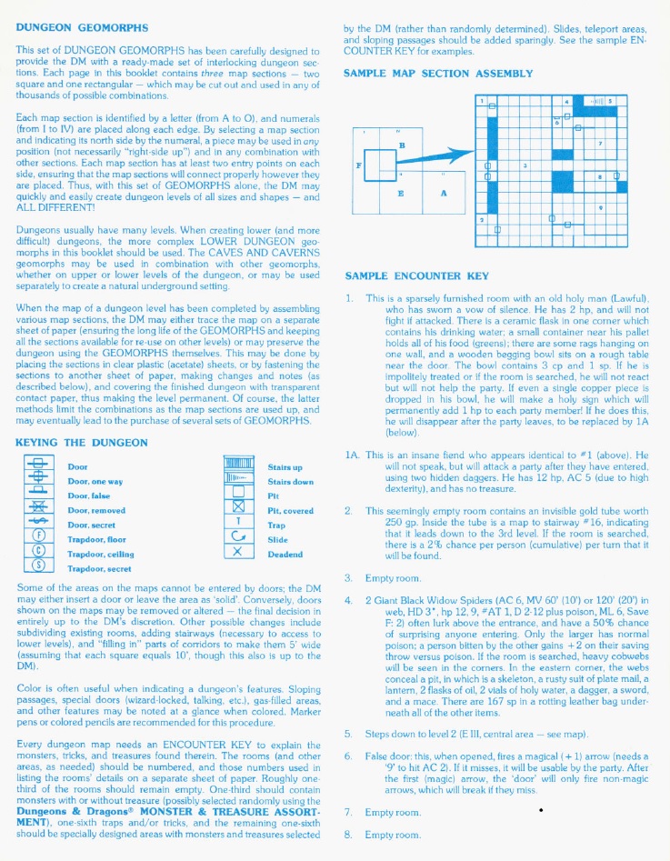 Not much to say about this, the cover tells it all, this is a compilation of three previous Dungeon Geomorphs, modular maps that DMs could use to build random dungeons. The most interesting thing here is the cover that clearly shows how D&D (as opposed to AD&D) is aimed at younger players, with this being one of the first times that a pre-pubescent kid is shown as the DM for the game, this shows something that will increase towards the 80s, aiming towards a younger audience with things like the animated series and coloring books etc.