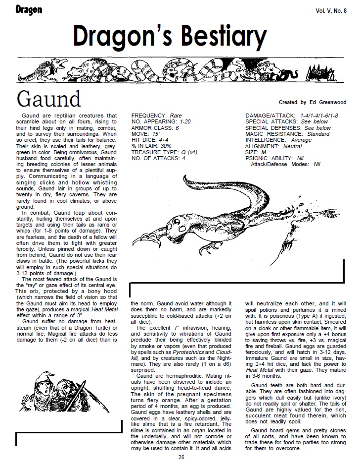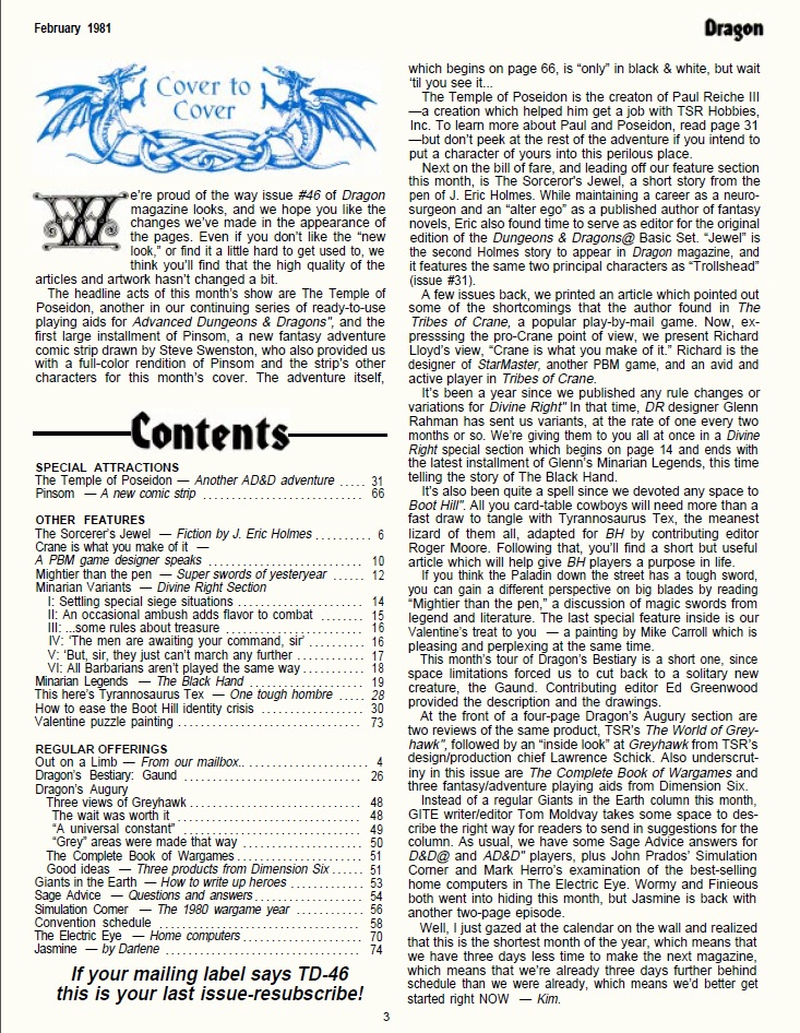 In this issue the magazine changed font for the interior text as well as column format (from 2 to 3 columns in most pages) making the magazine much easier to read while not sacrificing content. Much of the content in this issue is for Divine Right and other TSR games, however there are always things for D&D, like the Bestiary, featuring the Gaund, designed by Ed Greenwood as well as a whole adventure module entitled The Temple of Poseidon by Paul Reiche III, who would eventually be the co-creator of the Star Control computer games.