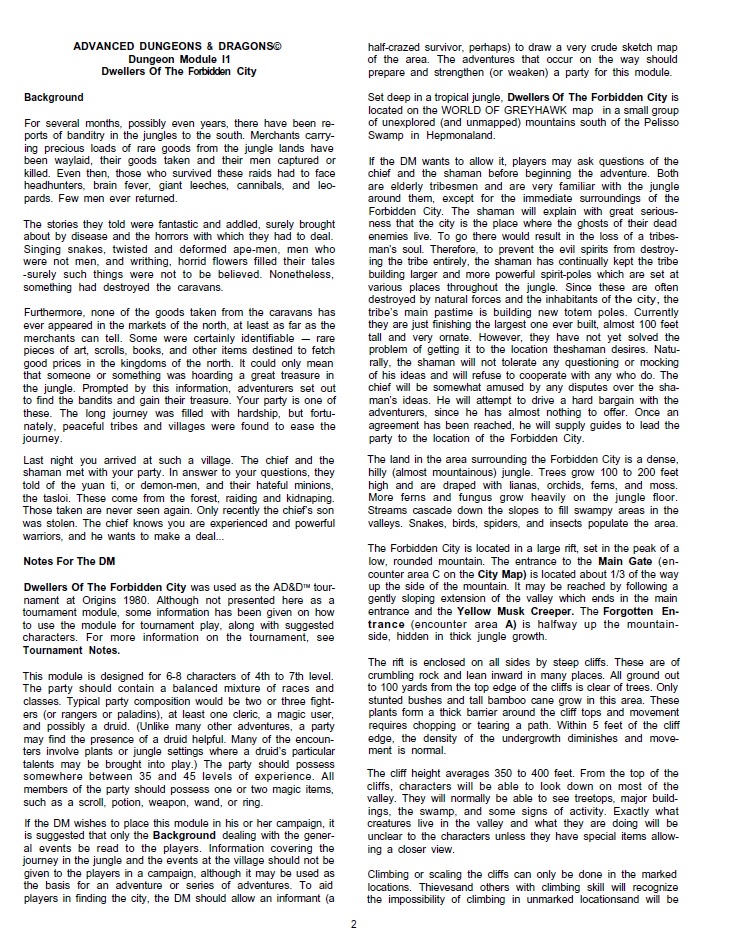 An adventure module that, like many others, had its origins as a tournament module, Dwellers of the Forbidden City is much more of a sandbox module than what we are used to now. There is a loose plot to it which impels the party to go explore the adventure area, but it’s not at all a comprehensive plot that covers the whole of the vast city and environments.