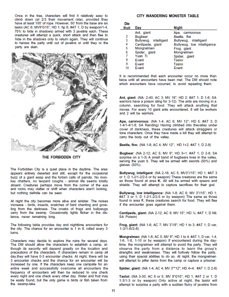 This of course allows DMs a lot of freedom to add story beats to the module and there are some suggestions at the end of the module on ideas that DMs can use. If you have ever read Conan it’s easy to see how this adventure is based on the Red Nails story, but there are also some added monsters here which in time would become iconic D&D monsters: the Aboleth, Tasloi and Yuan-Ti all make their debut here and they are all pretty great (always had a particular love for the Yuan-Ti myself).
