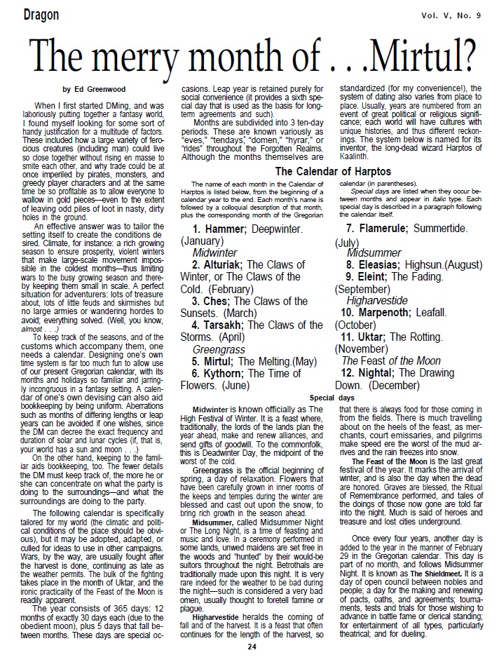 In the article “In the Merry Month of… Mirtul?” Greenwood talks about several concepts and ideas that will be staples of the Forgotten Realms setting which will only become an official AD&D setting in the late 80s. Ideas explored in the article, which is about how to create a calendar, include “tendays” as a substitution for weeks as well as the names of the months and feasts in the Forgotten Realms setting, including the Shieldmeet during leap years.