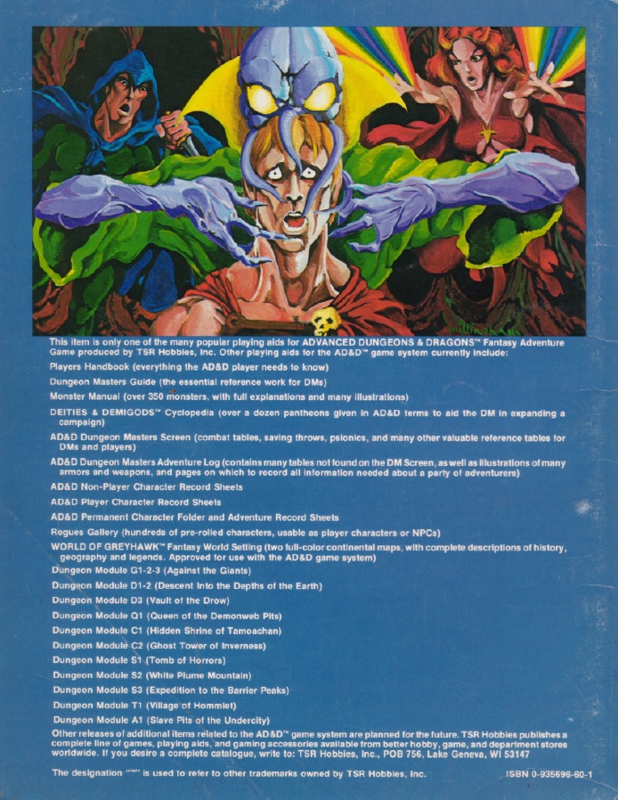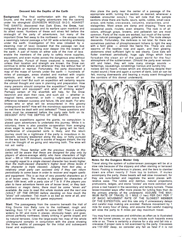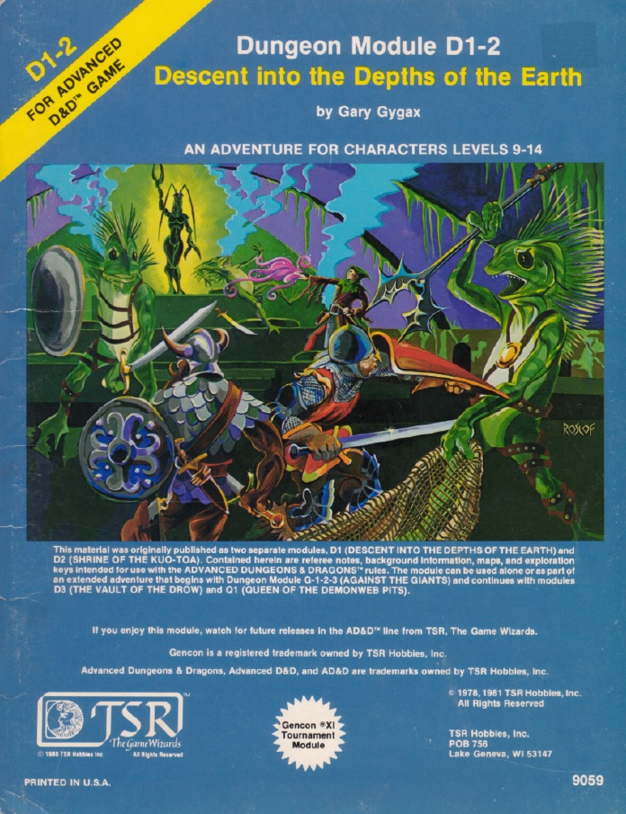 A repackaging of modules D1 and D2 from 1978, now with a color cover and a couple of new paragraphs explaining the place of the adventure in the wider campaign (after the G1-3 and before the Q1) which eventually would be published all together as GDQ 1-7 under the title Queen of the Spiders supermodule in 1986. So nothing new here, you can backtrack on this account to 1978 and take a look at D1: Descent into the Depths of the Earth and D2: Shrine of the Kuo-Toa for more details!