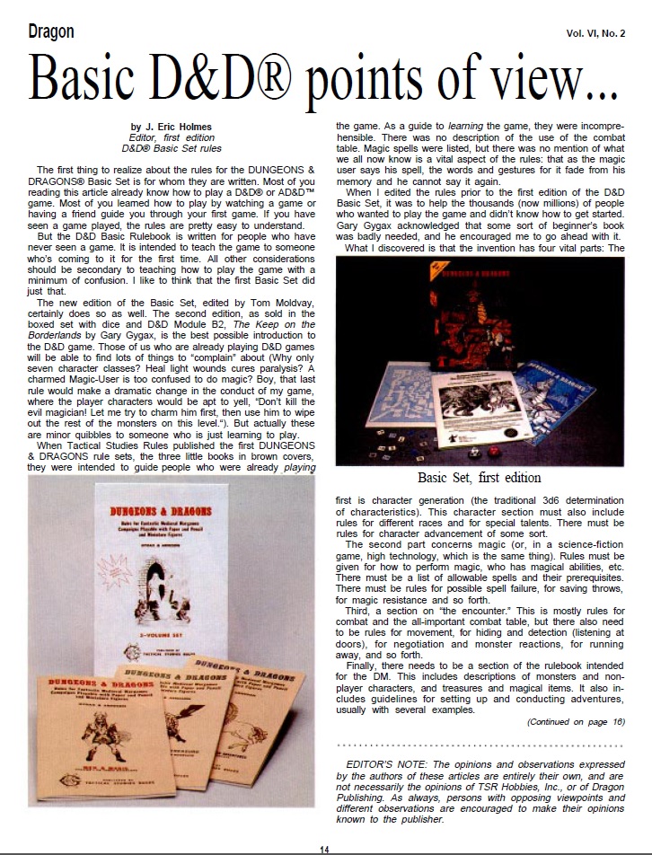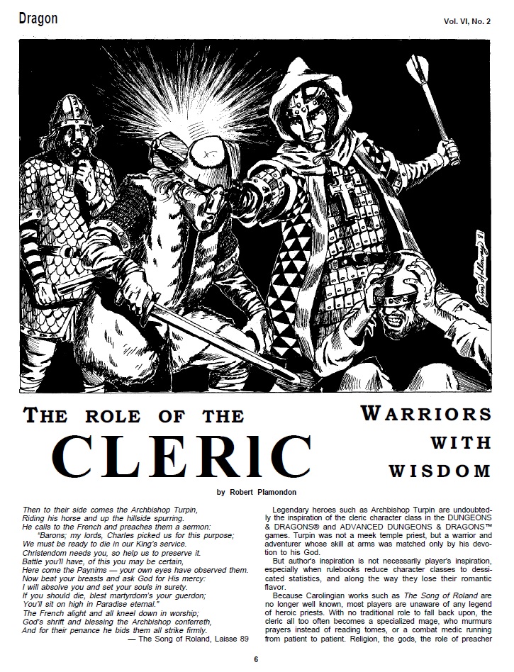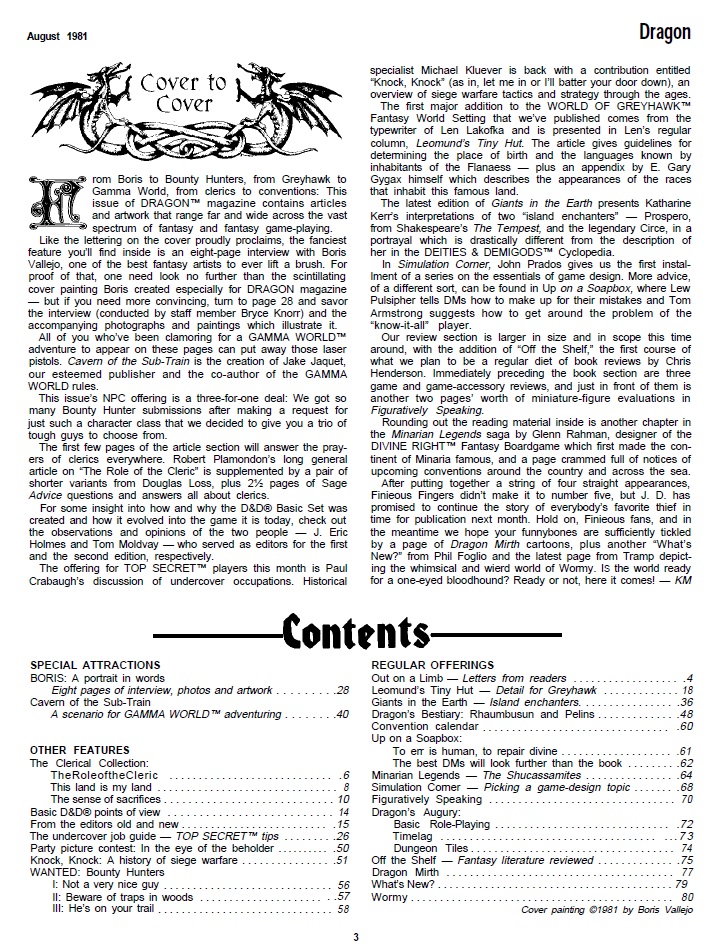 Inside the magazine you get a long interview with Boris with plenty of color reproductions of his paintings. In terms of D&D content you get a really long trio of articles on Clerics at the top of the magazine, and a Sage Advice column dedicated to answering questions on Clerics. You also get appreciations of the original blue cover box of Basic D&D and the newish replacement red box by both J. Eric Holmes and Tom Moldvay, the writers of both editions.