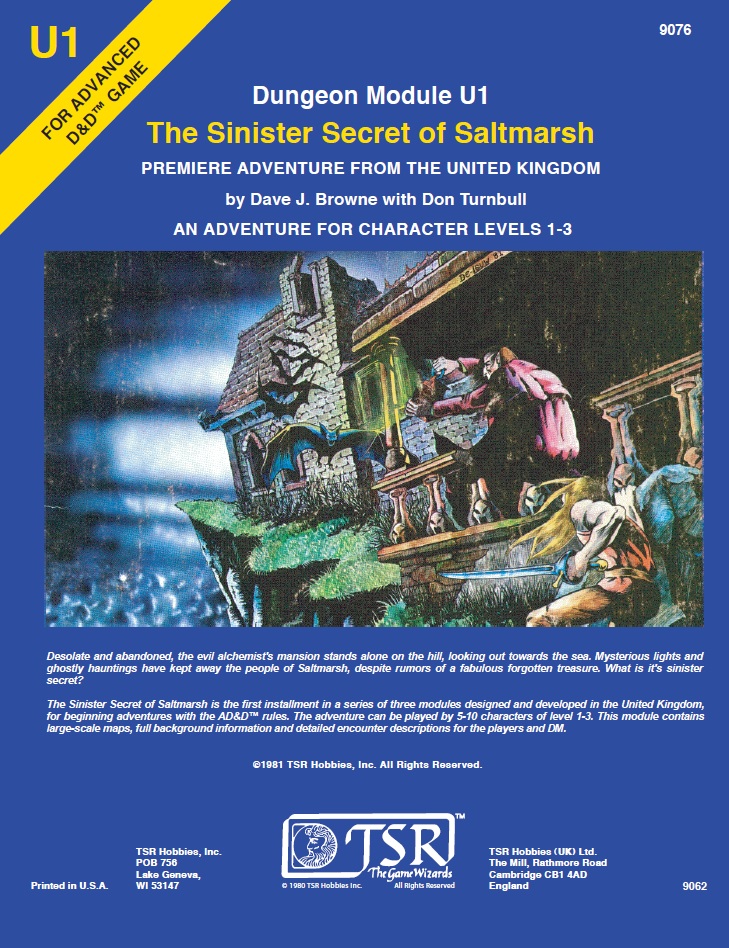 The second piece of AD&D material to come out of the UK, after the Fiend Folio earlier in the year, The Sinister Secret of Saltmarsh is a pretty classic module and a really good one as well. This was also a useful module as there were few things for beginner characters and this, being appropriate for characters of level 1-3, filled that pretty big gap in the AD&D modules.