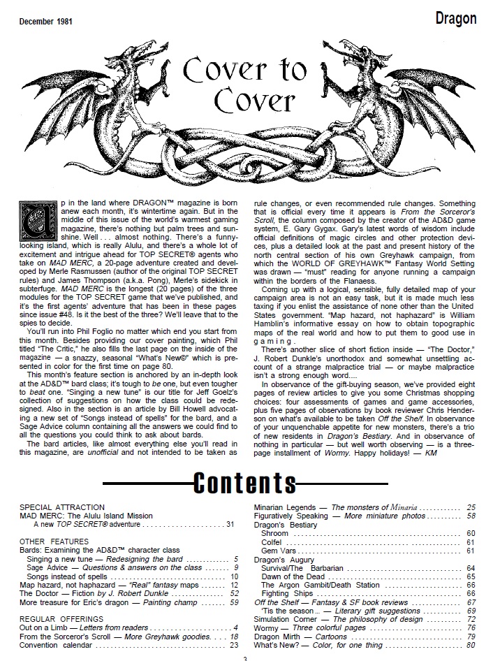 Closing out 1981 we get the December issue of Dragon with a cover by the great Phil Foglio starring his creations Phil and Dixie who get their first color comic strip inside this magazine. For D&D fans we get a whole rethink of the Bard class as well as a Sage Advice dedicated to questions about Bards and an interesting development of the idea of “songs instead of spells” for the bard class.