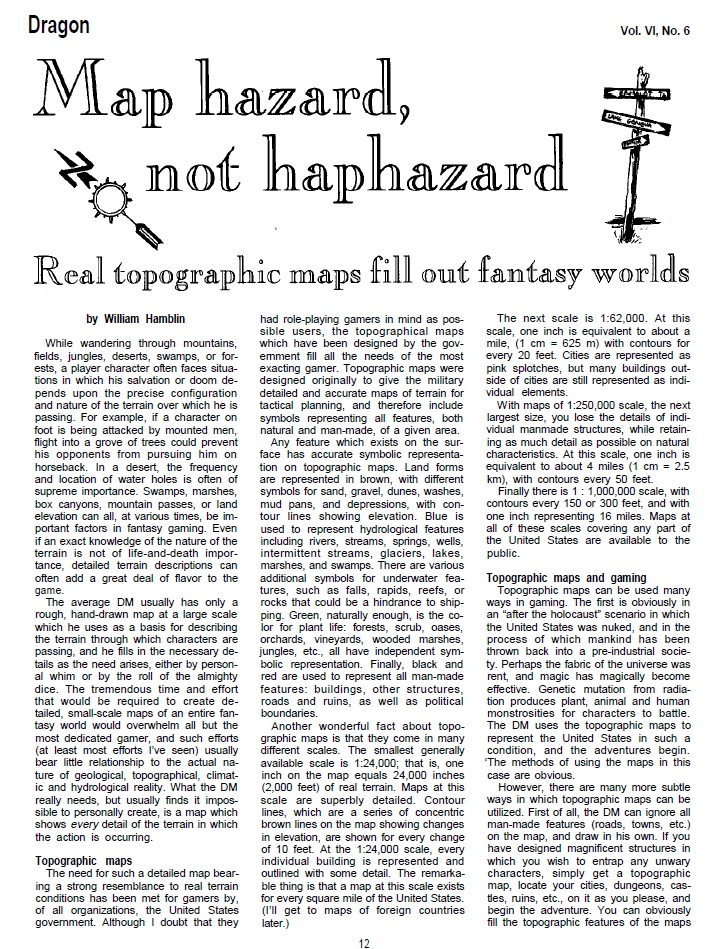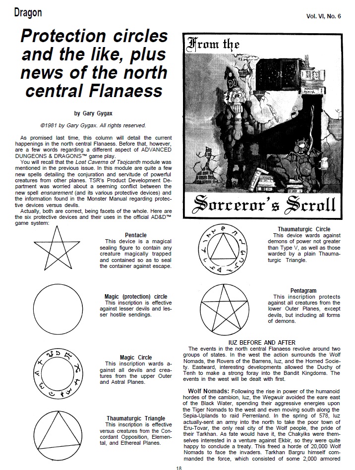 The longest and most interesting article of the issue is Gygax’s second entry in a row about the world of Greyhawk for which he is just dumping a lot of info on us, and will continue to do so for the foreseeable future. Here we get in his From The Sorcerer’s Scroll column a huge amount of information about north-central Flanaess. This includes a lot of reports on military movements and wars between factions like the Wolf Nomads, Iuz, the Bandit Kingdoms or the Duchy of Tehn, but this comes off as really dry because Gygax does not explore the reasons and motivations of each faction, this feels more like a “wargame” report than an actual developing of deep lore. Hopefully these get better.