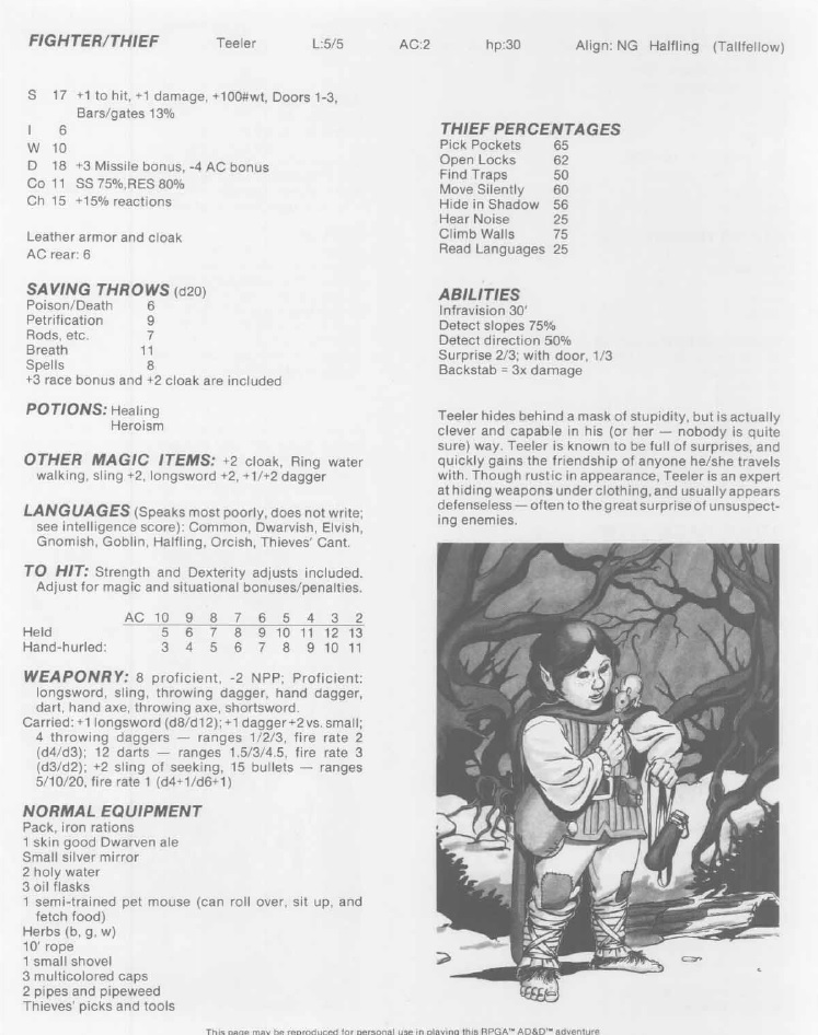 Another first here is what I think is the first non-binary character in D&D. Maybe I missed one before, but one of the pre-rolled characters here, a Halfling Fighter/Thief is of indeterminate gender, which is pretty cool.