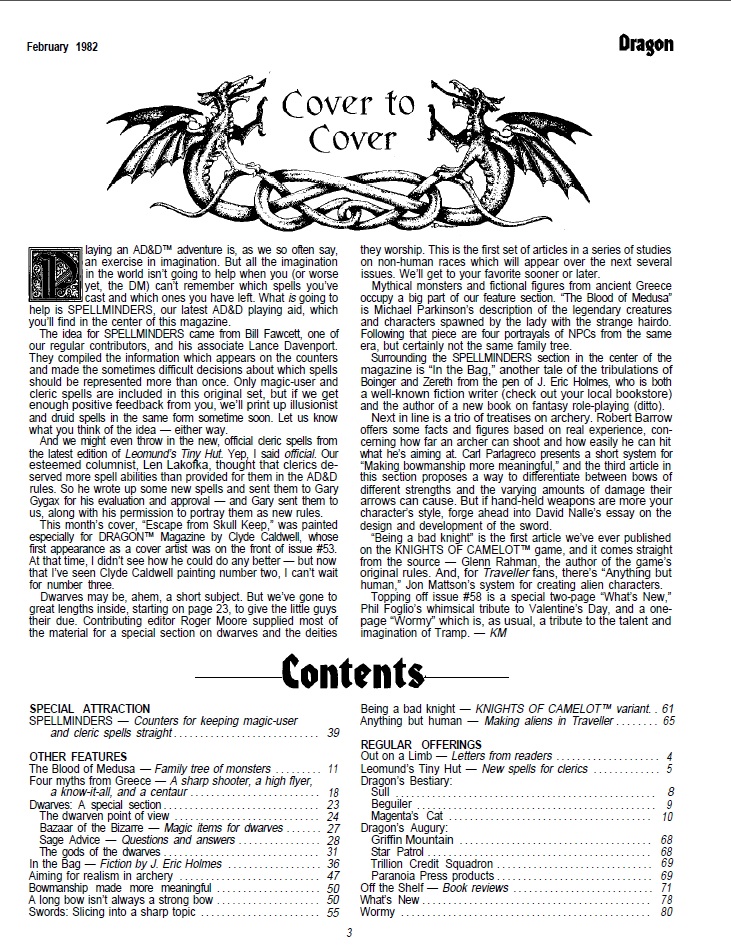 With an iconic Clyde Caldwell cover, which sets the tone for 80s D&D art, and increasingly the cover art for Dragon magazine, as the more cartoonish style is falling out of favor, so much so that although Phil Foglio, who did the cover for #56, will continue with the magazine doing the What’s New with Phil and Dixie comic strip, he will not get another cover until the 2000s! The same happens to Erol Otus who had his last cover with issue #55. This marks a move to a more “serious” high fantasy, painterly style for the game.