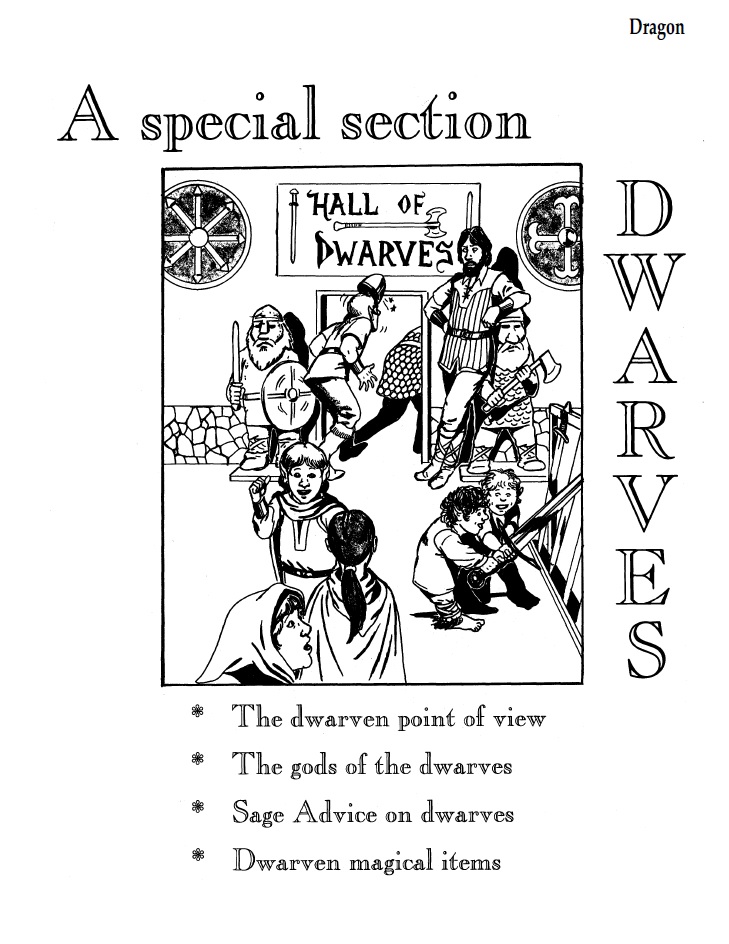 In the interior we have a bunch of really useful articles, particularly for Clerics and Dwarves, with Lakofka adding new official Cleric spells in Leomund’s Tiny Hut column and a whole special section on Dwarves, drawing from several AD&D sources and beyond to give a general view of Dwarves in the game as well as their practices and beliefs, and a section on dwarven gods, some dwarven magical items in a special edition of Bazaar of the Bizarre and a whole Sage Advice column answering questions on dwarves.