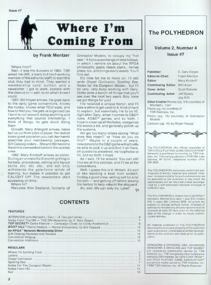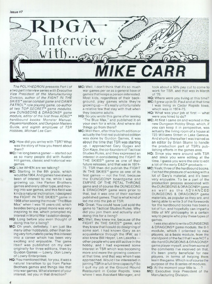 In this issue Frank Mentzer says goodbye to editing duties as he moves on to bigger things at TSR and we get the first part of a several part interview with Mike Carr, mostly covering his games Fight in the Skies and Dawn Patrol, but also with plenty about Gen Cons present and past.